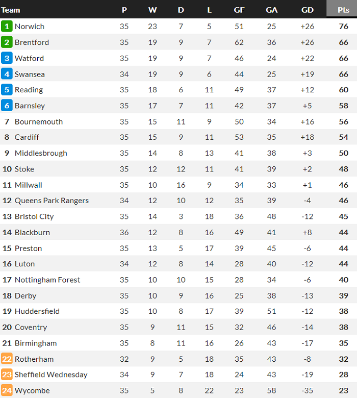 Tuy nhiên, Swansea vẫn thi đấu ít hơn Watford 1 trận. Bởi vậy, Thiên nga vẫn sở hữu quyền tự quyết trong cuộc đua giành suất thăng hạng trực tiếp còn lại với chính Watford và Brentford.