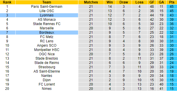 Lyon đang xếp thứ 3 trên bảng xếp hạng Ligue 1. Sau 21 vòng đấu Sư tử vùng sông Rhone đã giành được 43 điểm, xếp thứ 3 trên bảng xếp hạng và chỉ kém đội đầu bảng PSG 2 điểm. Trong khi đó Bordeaux sau 21 trận mới giành được 32 điểm, xếp sau Lyon 4 bậc. Vì vậy ở trận đấu sắp tới, Lyon hoàn toàn xứng đáng được xếp cửa trên cùng lợi thế sân nhà.