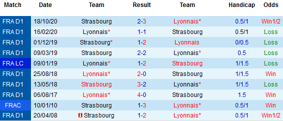 Thành tích đối đầu trên sân nhà đang nghiêng hẳn về Lyon khi họ bất bại tới 8 trong 9 lần tiếp đón Strasbourg gần nhất, với 7 chiến thắng. Ở thời điẻm hiện tại cũng không nhiều lý do để chờ đợi vào kết quả bất ngờ từ đội khách.
