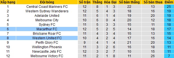 Bảng xếp hạng giải VĐQG Úc trước vòng 13