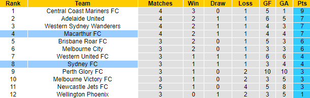 Phong độ và thống kê đối đầu Macarthur vs Sydney