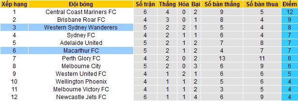 Tuy nhiên hiện tại Western Sydney Wanderers vẫn đang kém 2 đội xếp ngay trên 1 điểm và bị đội dẫn đầu Central Coast Mariners bỏ xa tới 4 điểm.