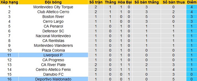 Bảng xếp hạng giải VĐQG Uruguay vòng 2