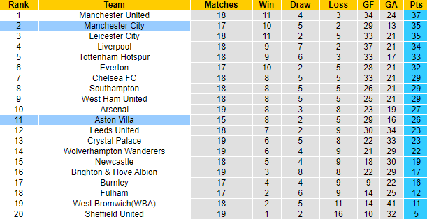 Man City lúc này đã chính thức trở lại cuộc đua vô địch Premier League. Sau 27 trận, đội chủ sân Etihad giành 35 điểm, xếp thứ 2 trên bảng xếp hạng. Kém đội đầu bảng Man United 2 điểm nhưng Man City lại đá ít hơn 1 trận. Vì vậy trận đấu sắp tới với Aston Villa, Man xanh có thêm động lực để hướng về chiến thắng.