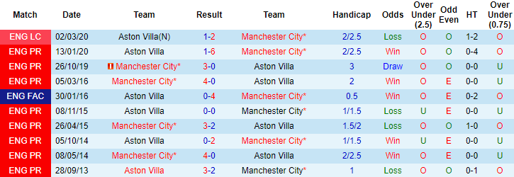 5 lần chạm trán Aston Villa gần đây, Man City toàn thắng, xé lưới đối thủ 19 lần. 8 trận liên tiếp gần đây tính trên mọi đấu trường, Man City toàn thắng, giữ sạch lưới 6 trận. Dẫu vậy trước giờ bóng lăn Aston Villa vẫn hứa hẹn mang đến nhiều khó khăn cho đoàn quân của HLV Pep Guardiola.