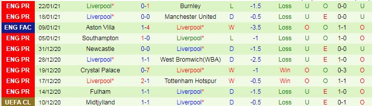 + Thống kê 10 trận gần nhất của Liverpool