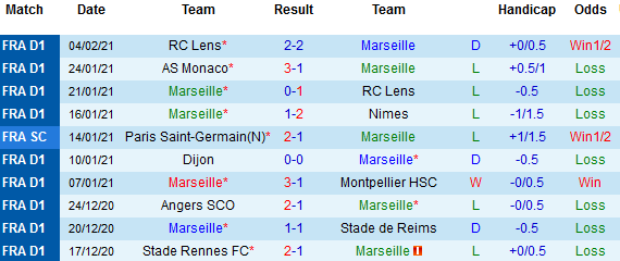 + Thống kê 10 trận gần nhất của Marseille