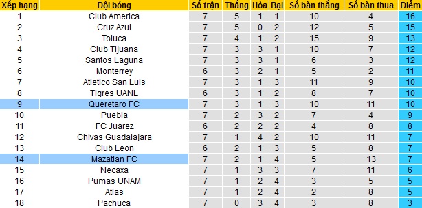 Bảng xếp hạng giải VĐQG Mexico trước vòng 8