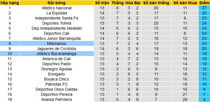 Bảng xếp hạng giải VĐQG Colombia vòng 14