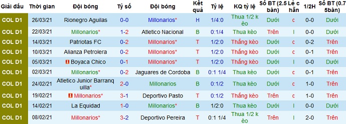 + Soi tỷ lệ kèo châu Á: Đứng trên đối thủ ở bảng xếp hạng và được thi đấu trên sân nhà nên Millonarios vẫn được đánh giá là đội cửa trên. Không những thế kèo chấp còn ở mức khá cao là -0,75 và còn có xu hướng tăng lên -1.