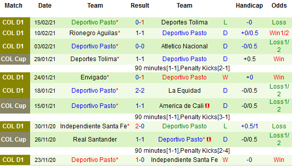 + Thống kê 10 trận gần nhất của Deportivo Pasto