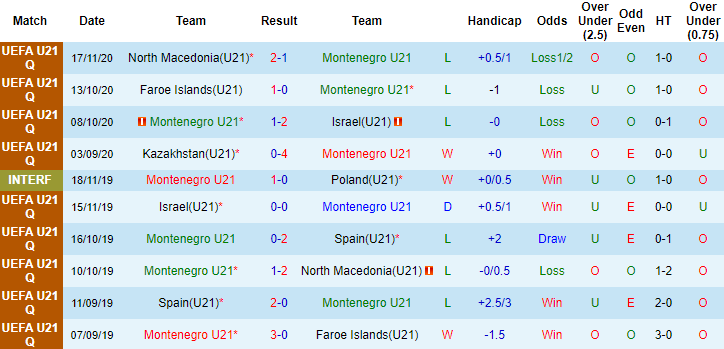 Lứa cầu thủ hiện tại của Montenegro U21 không được đánh giá cao về mặt chất lượng. 3 trận gần đây họ toàn thua cả về tỷ số và kèo châu Á. Trên sân nhà, 3 trận đấu chính thức gần đây Montenegro U21 cũng đều tay trắng rời cuộc chơi, thủng lưới mỗi trận 2 lần.