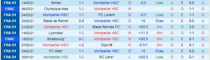 + Thống kê 10 trận gần nhất của Montpellier