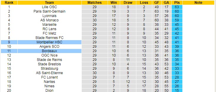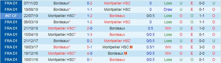 Phong độ và thống kê đối đầu Montpellier - Bordeaux gần đây: