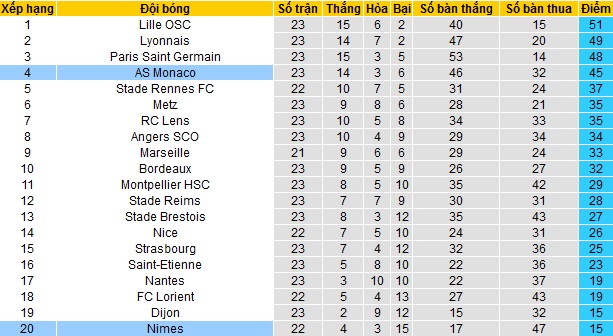 Trong khi đó Monaco vẫn đang ra sức bám đuổi các đội tốp đầu trên bảng xếp hạng. Hiện tại Monaco đang đứng thứ tư với 45 điểm sau 23 vòng đấu. Đây là thành tích khá tiến bộ của đội bóng nếu so với vị trí thứ 9 của mùa giải trước, tuy nhiên Monaco vẫn đang kém đội thứ ba PSG 3 điểm cũng như kém đội đầu bảng Lille tới 6 điểm.