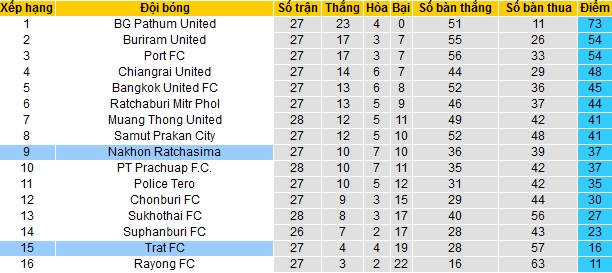 Trong khi đó Trat FC vẫn chỉ đang đứng áp chót bảng xếp hạng. Với 16 điểm có được sau 27 vòng đấu, Nakhon Ratchasima còn đang cách nhóm các đội trụ hạng 11 điểm nên chắc chắn đã phải xuống chơi tại Thai-League 2 từ mùa giải tới.