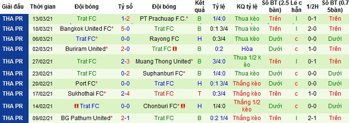 + Thống kê 10 trận gần nhất của Trat FC