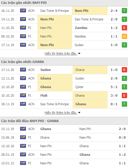 Phong độ và thống kê đối đầu gần đây Nam Phi vs Ghana: