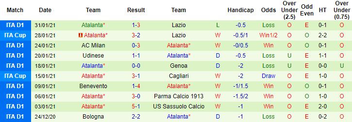 Bên phía đội khách, Atalanta tạo nên sự tin tưởng lớn nhờ phong độ ổn định. 15 trận vừa qua Atalanta bất bại 14 lần với 10 thắng, 4 hòa. Trên sân khách, 20 trận trước đó tính trên mọi đấu trường, Atalanta không thua 19 trận cùng thành tích cụ thể là 13 chiến thắng và 6 trận hòa.
