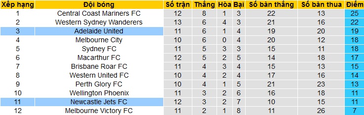 Trong khi đó Adelaide United hiện đã vươn lên vị trí thứ 4 của bảng xếp hạng. Với 19 điểm sau 11 vòng đấu, Adelaide United chỉ còn kém đội thứ ba Macarthur 1 điểm cũng như kém đội nhì bảng Western Sydney 3 điểm nhưng thi đấu ít hơn tới 2 trận.