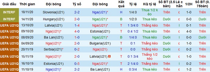 + Thống kê 10 trận gần nhất của Nga U21