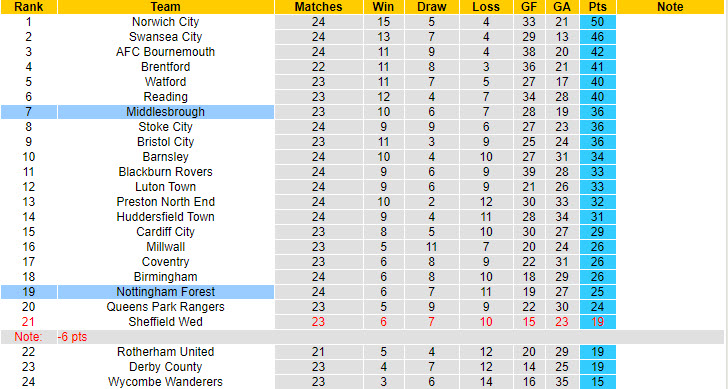 Một điểm cần đặc biệt lưu ý, Middlesbrough từng thua tới 6, hòa 4 và chỉ thắng đúng 1 lần trong số 11 trận vừa rồi làm khách trên sân của Nottingham Forest. Với những thống kê trên, Middlesbrough nhận một kết quả trắng tay là kịch bản được dự đoán trước.
