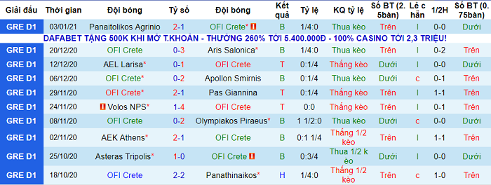 OFI Crete không ghi quá 2 bàn/trận trong cả 8 trận được thi đấu trên sân nhà tại giải VĐQG Hy Lạp mùa này. Hai đội vì thế khó chinh phục mốc Tài Xỉu là 2 1/4.