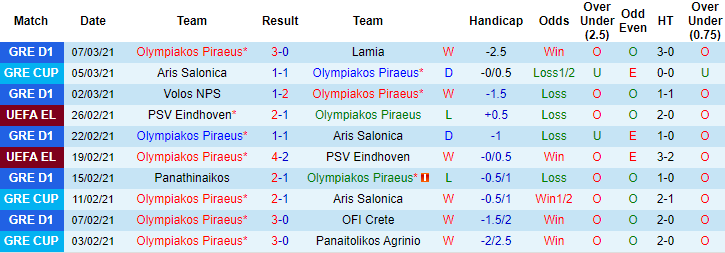 + Thống kê 10 trận gần nhất của Olympiakos