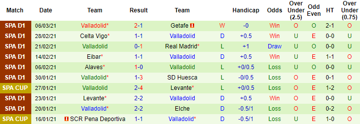+ Thống kê 10 trận gần nhất của Valladolid