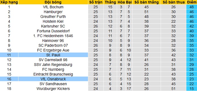 Trong khi đó St. Pauli cũng chỉ đang đứng thứ 12 trên bảng xếp hạng với 32 điểm sau 25 vòng đấu. Tuy nhiên hiện tại St. Pauli vẫn đang hơn nhóm các đội trong nhóm cầm đèn đỏ tới 9 điểm, khoảng cách được coi là khá an toàn khi giải còn 9 vòng đấu nữa