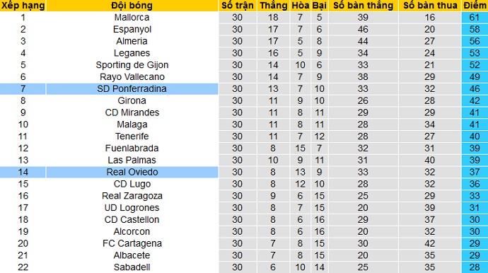 Sau 30 vòng đấu tại giải hạng nhì Tây Ban Nha, Oviedo chỉ đang đứng thứ 14 trên bảng xếp hạng. Với 37 điểm có được, khoảng cách của Oviedo với nhóm các đội cầm đèn đỏ đang là 7 điểm trong khi giải vẫn đang còn tới 12 vòng đấu nữa.