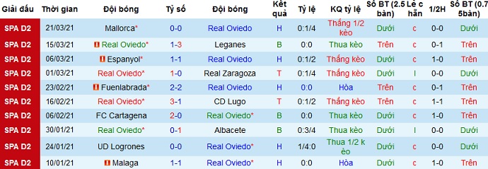 Ở 5 trận đấu gần đây Oviedo chỉ có được 1 trận thắng, để hòa 3 trận và thua 1 trận. Ngay trên sân nhà thành tích của đội bóng cũng không thật ổn định khi đội bóng đang thắng 2, hòa 1 và để thua 2 sau 5 trận gần nhất tại đây.