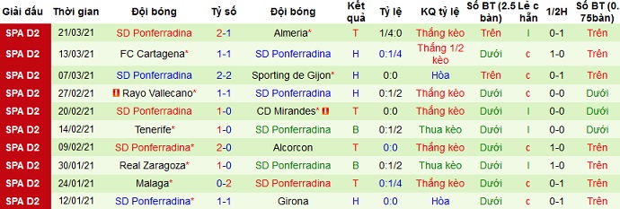 Thành tích gần đây của Ponferradina là tương đối tốt khi bất bại ở cả 5 trận gần nhất nhưng chỉ có được 2 trận thắng và 3 trận hòa. Thế nhưng trên sân khách Ponferradina lại chỉ có được 1 trận thắng, 2 trận hòa và để thua 2 trận sau 5 lần du đấu gần nhất.