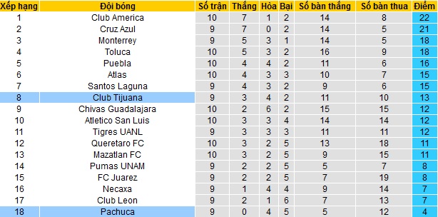 Trong khi đó Club Tijuana đang đứng ở vị trí thứ 8, trong nhóm các đội có suất dự play-off. Với 13 điểm có được sau 9 vòng đấu, Club Tijuana hiện đã kém các đội Top 4 là 5 điểm đồng thời cũng chỉ hơn các đội nằm ngoài Top 12 có 2 điểm.