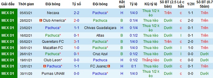 + Thống kê 10 trận gần nhất của Pachuca