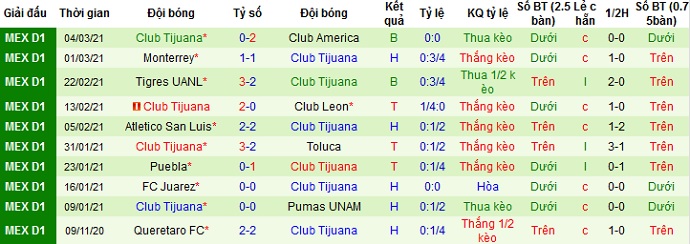 + Thống kê 10 trận gần nhất của Club Tijuana