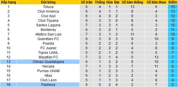Bảng xếp hạng giải VĐQG Mexico vòng 7