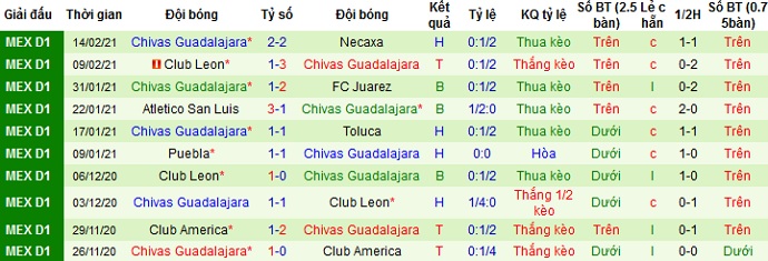 + Thống kê 10 trận gần nhất của Guadalajara Chivas