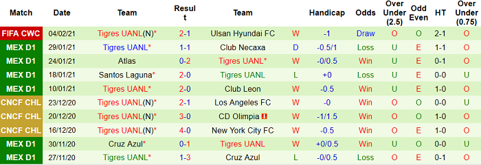 - Thống kê 10 trận gần nhất của Tigres UANL