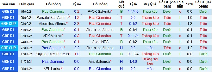 Trong 5 trận đấu gần đây PAS Giannina có được 3 trận thắng, để thua 2 trận bao gồm cả trận thắng tại cúp quốc gia. Thế nhưng ngay trên sân nhà thành tích của PAS Giannina lại khá tệ khi đã không thắng trong 7 trận gần nhất tại đây với 3 trận hòa và 4 trận thua.