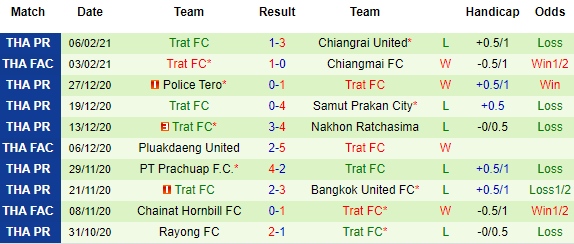 + Thống kê 10 trận gần nhất của Trat FC
