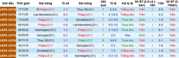 + Soi tỷ lệ kèo châu Á: Mặc dù cùng là các đội đầu bảng trong giai đoạn vòng loại nhưng Pháp U21 vẫn được đánh giá cao hơn, không những thế kèo chấp còn đang là -1.