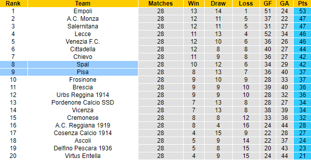 Trận đối đầu giai đoạn lượt đi, SPAL đã vùi dập Pisa với tỷ số 4-0. Lần gần nhất làm khách trên sân của Pisa, SPAL giành chiến thắng với tỷ số 2-1. Sau 28 vòng đấu tại giải hạng 2 Italia mùa này, SPAL cũng đang có nhiều hơn Pisa 5 điểm: SPAL có 42 điểm, Pisa giành 37 điểm.