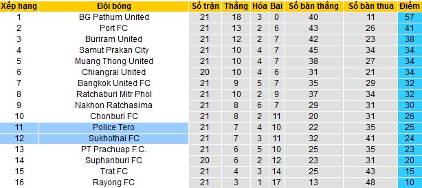Sau 21 vòng đấu tại giải vô địch quốc gia Thái Lan, Police Tero và Sukhothai đang đứng sát nhau trên bảng xếp hạng. Nếu như Police Tero có được 25 điểm và đang đứng thứ 11 thì Sukhothai xếp ngay dưới với 1 điểm ít hơn.