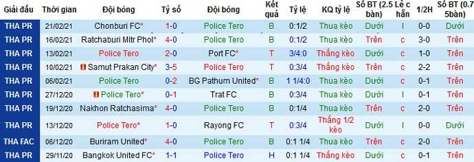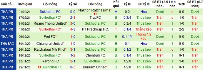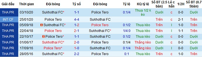 Ở 5 lần đối đầu gần nhất Police Tero vẫn đang là đội chiếm ưu thế với 2 trận thắng và 3 trận hòa. Mặc dù không có được phong độ tốt nhất nhưng Sukhothai đang thi đấu rất tệ trên sân khách, cộng với tính chất quan trọng của trận đấu nên chọn cửa trên vẫn là lựa chọn có cơ sở và có phần hợp lý.