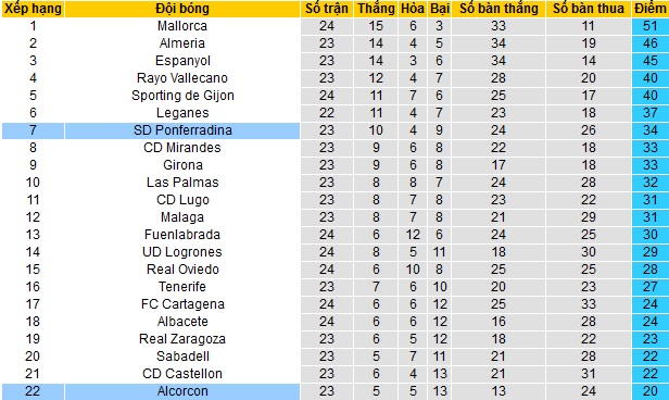 Bảng xếp hạng giải hạng nhì Tây Ban Nha vòng 24