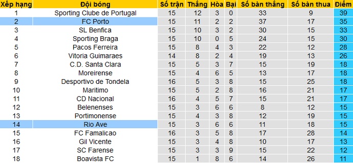Trong khi đó Rio Ave chỉ đang đứng thứ 12 trên bảng xếp hạng với 15 điểm cũng sau 15 vòng đấu. Tuy đang đứng trên nhóm cầm đèn đỏ tới 4 bậc nhưng khoảng cách hiện đang chỉ là 1 điểm.