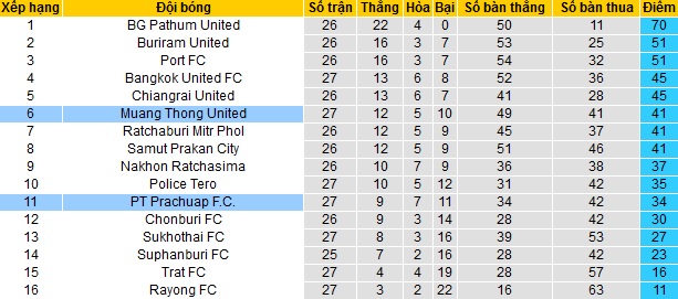 Trong khi đó Muang Thong United đang đứng thứ 8 trên bảng xếp hạng với 41 điểm có được cũng sau 27 vòng đấu. Hiện tại đội bóng đang bỏ xa nhóm các đội cuối bảng nhưng cũng kém vị trí dự cúp châu lục tới 13 điểm nên coi như đã không còn mục tiêu cụ thể nào ở 3 vòng đấu còn lại.