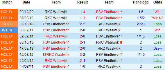 Phong độ hiện tại trên sân nhà với PSV Eindhoven cũng rất ấn tượng khi họ vừa thắng tới 7 trong 8 trận gần nhất tiếp đón các đối thủ gần đây. Trong khi đó, RKC Waalwijk dần tỏ ra đuối sức ở giai đoạn cuối lượt đi. Đội khách liên tiếp chỉ biết đến hòa và thua cả 6 vòng gần đây là minh chứng rõ ràng nhất.