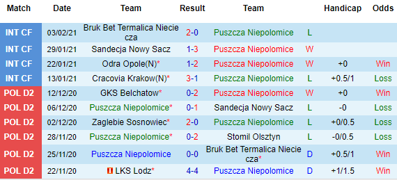 + Thống kê 10 trận gần nhất của Puszcza Niepolomice
